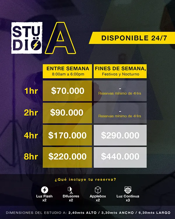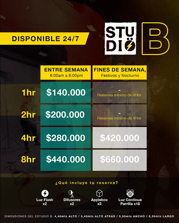 Cuando contratas nuestro estudio fotográfico, también te ofrecemos alquiler de cámara fotográfica, equipos de grabación de video, luces LED para fotografías, alquiler de estabilizador de cámara, parrillas de luces, alquiler de consola de sonido y más. Tenemos todo lo que necesitas. ¡Diligencia el formulario ahora mismo y déjanos ser tu socio en el camino hacia la realización de tus proyectos audiovisuales más exitosos!